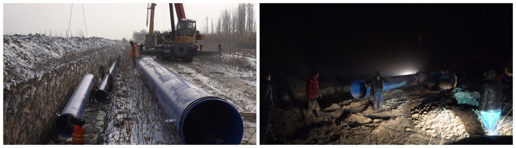 該工程是在野外長距離作業,管道沿途需要穿過高速、省道、鐵路、亞歐光纜及眾多鄉村道路和田間陰溝,施工區域內有農田、戈壁、沙漠,沼澤等,自然環境極其惡劣,施工地質極為復雜。尤其在步入11月,新疆烏蘇市正式進入寒冬季節,期間平均氣溫都在零下十度以下,并時常飛舞著雪花,由于晝夜溫差大,夜間項目上的氣溫更是達到零下二三十度,這給項目部施工帶來了嚴重挑戰,但項目部員工沒有被惡劣的環境所嚇倒,他們“逢山開路、遇水搭橋”,努力克服各方面不利因素,合理安排施工進度計劃。全體職工發揚安徽建工人“特別能吃苦,特別能戰斗”的企業作風,在公司“大干60天”勞動競賽的正向激勵下,不畏環境艱苦,抓質量,保安全,戰荒漠,斗嚴寒,每天堅持戰斗在生產第一線,哪里有施工,哪里就有管理人員的堅定身影。