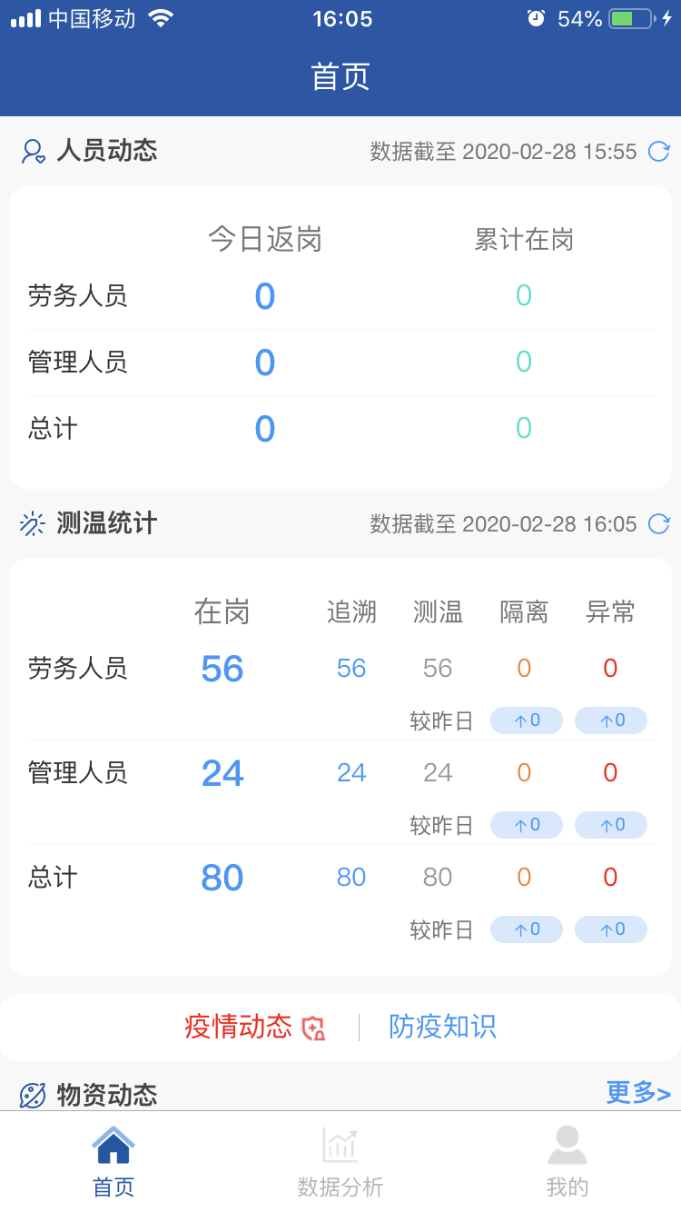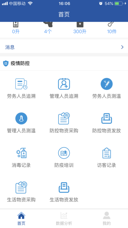 項(xiàng)目全面推行“返崗復(fù)工疫情防控系統(tǒng)”APP。主頁(yè)面包括勞務(wù)人員追溯、勞務(wù)人員測(cè)溫、防控物資采購(gòu)、消毒記錄、疫情培訓(xùn)等11個(gè)專(zhuān)題版面,通過(guò)這些功能可線上及時(shí)填報(bào)人員返崗日期、體溫、癥狀及是否為留守人員等詳細(xì)信息,還有項(xiàng)目部的疫情物資采購(gòu)情況、環(huán)境衛(wèi)生的消殺情況等相關(guān)信息,使上線人員時(shí)時(shí)了解疫情防控動(dòng)態(tài),充分借助信息技術(shù)手段,全力打贏疫情防控“戰(zhàn)役”。 借助這一平臺(tái)確保項(xiàng)目部實(shí)時(shí)、準(zhǔn)確、有效地掌握現(xiàn)場(chǎng)人員的健康情況,助力疫情防控工作。