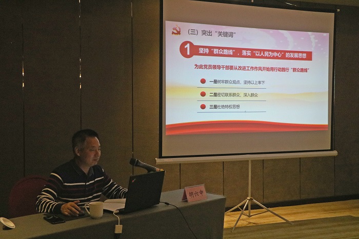 胡六中在報告中帶領大家共同回顧了習近平總書記考察安徽行程路線和重要講話精神,他指出,總書記在考察中多次提到“要牢固樹立以人民為中心的發(fā)展思想”“要踐行黨的宗旨,樹牢群眾觀點”“要多謀民生之利、多解民生之憂”,全體黨員領導干部一要從改進工作作風開始用行動踐行“群眾路線”,落實“以人民為中心”的發(fā)展思想;二要堅持“黨管干部”,全面深化干部制度改革;三要堅持“一體化”和“高質(zhì)量”,推動黨建與生產(chǎn)經(jīng)營深度融合。