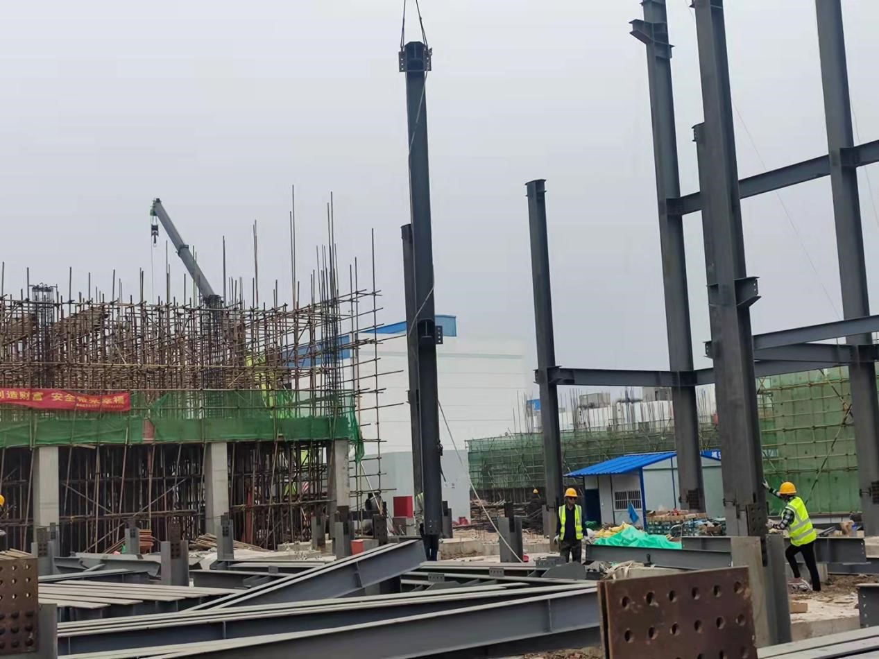 發(fā)酵車間C區(qū)鋼結(jié)構(gòu)區(qū)域,吊裝作業(yè)正在如火如荼進行;B區(qū)滿堂腳手架緊張搭設(shè),鋼筋工頂著烈日進行鋼筋綁扎,投料車間兩臺挖機聯(lián)動,進行管廊支架基礎(chǔ)基坑開挖,控制車間正在忙忙碌碌進行內(nèi)墻二次結(jié)構(gòu)砌筑。各個車間有條不紊的忙碌著,整個項目現(xiàn)場一片火熱,迅速掀起“比、學、趕、幫、超”施工高潮!
