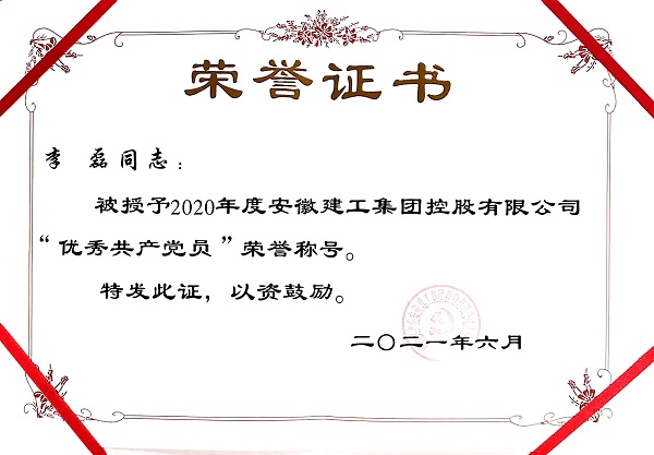 作為一名共產黨員,他處處以黨員的標準嚴格要求自己,聯系群眾和遵紀守法等各方面都較好的發揮著共產黨員的先鋒模范作用,得到領導和同事們的一致好評,榮獲2020年度“建工集團年度優秀共產黨員”稱號。