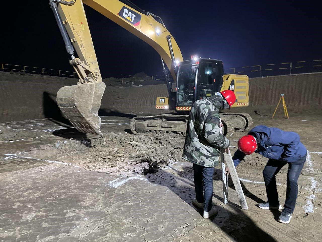 為滿足西動力中心承臺澆筑要求,施工現(xiàn)場燈火通明,項目經(jīng)理徐明東帶領(lǐng)施工員正在認(rèn)真進行西動力中心承臺基礎(chǔ)測量復(fù)核工作。