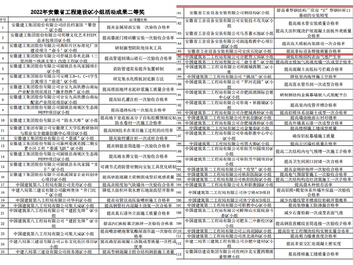 其中安徽安裝公司阜陽市潁東區中醫院QC活動小組完成的《提高通風空調風管系統嚴密性合格率》榮獲2022年安徽省工程建設QC小組活動成果一等獎。安徽安裝公司安徽省安暖通QC攻關小組完成的《提高不銹鋼空調供回水管質量合格率》、鋼結構QC小組完成的《提高重型鋼結構廠房雙“H”型鋼柱杯口基礎的安裝精度》等六項課題榮獲2022年安徽省工程建設QC小組活動成果二等獎。安徽安裝公司公司邊坡鉆孔QC小組完成的《提高碎礫石地層邊坡網施工一次鉆孔的成孔率》、安慶石化項目技術攻關QC小組完成的《提升設備基礎二次灌漿質量》等四項課題榮獲2022年安徽省工程建設QC小組活動成果三等獎。
