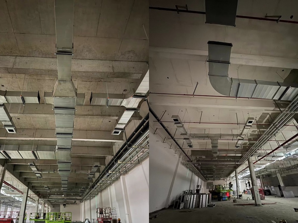 目前,焊裝車間循環(huán)水系統(tǒng)、消火栓系統(tǒng)、給排水系統(tǒng)、壓縮空氣已完成全部管道安裝任務(wù),進(jìn)入吹掃試驗階段。電氣系統(tǒng)進(jìn)入電纜放線和柜體箱體安裝階段,暖通系統(tǒng)進(jìn)入屋頂閣樓安裝階段。