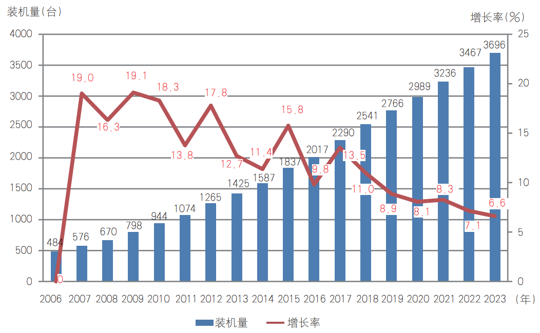 表1 2006~2023年中國內(nèi)地機(jī)組式柔性版印刷機(jī)裝機(jī)量及增長率