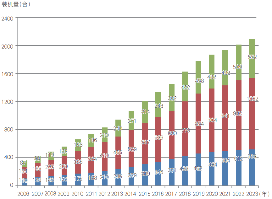 如圖2,將三大印刷產(chǎn)業(yè)帶進(jìn)行對比,2023年珠三角地區(qū)裝機(jī)量為519臺,約占有明確地區(qū)分布裝機(jī)總量的17.0%,增量為7臺;長三角地區(qū)裝機(jī)量為1022臺,占比為33.4%,增量為30臺;環(huán)渤海地區(qū)裝機(jī)量為552臺,占比為18.1%,增量為24臺。整體來看,三大印刷產(chǎn)業(yè)帶的裝機(jī)量累計(jì)為2093臺,占有明確地區(qū)分布裝機(jī)總量的68.4%,裝機(jī)增量為61臺。