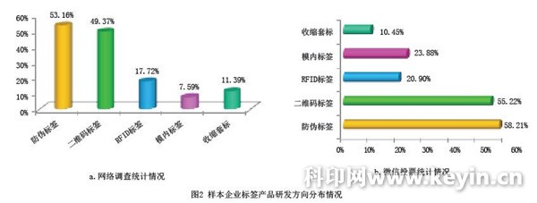 工藝技術創新在產品上的體現,則主要集中于防偽標簽、溯源和物流追溯標簽、個性化促銷標簽等產品領域。網絡調查反饋情況是:53.16%的樣本企業將主要研發方向定位于防偽標簽,49.37%的樣本企業將可變信息二維碼標簽作為主要研發方向,17.72%的樣本企業將研發RFID標簽作為2016年的重點,7.59%的樣本企業在開發模內標簽,11.39%的樣本企業則在收縮套標領域深耕,見圖2-a。而微信投票的統計結果則如圖2-b所示,其中研發模內標簽的占比較之網絡調查結果更突出。