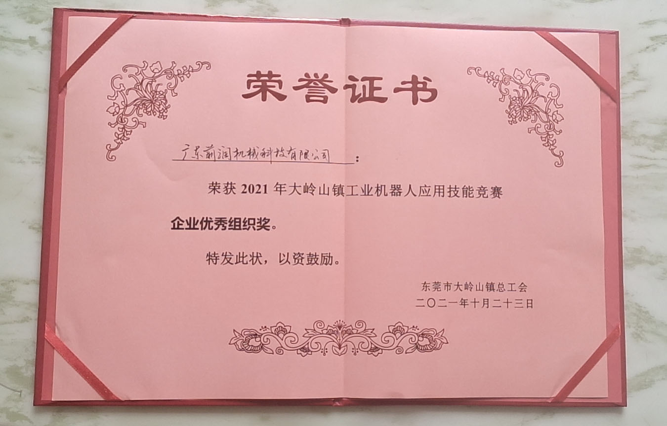 為積極響應我市提倡打造技能人才之都的號召發展壯大技能人才隊伍10月22日-23日東莞市大嶺山鎮總工會組織舉辦工業機器人應用技能競賽前潤機械積極響應號召參賽其中前潤機械榮獲三等獎 ,前潤機械獲企業優秀組織獎