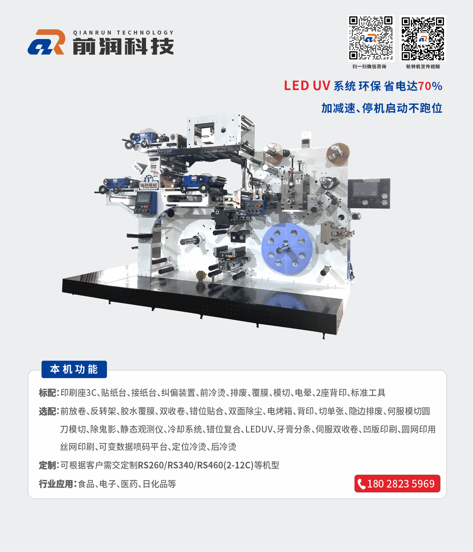 主營設備:商標印刷機、衛星式輪轉印刷機、模切機 等產品,公司可為客戶量身制定商標機、輪轉機等自動化解決方案。公司有強大的研發體系,確保能為客戶量身定制各類非標且最有價值的產品;前潤機械在國內外擁有極高的市場占有率及良好的信譽,贏得了眾多知名企業的青睞與合作,產品暢銷多個國家和地區,市場銷量近萬臺;我們愿與您攜手合作,建立長久雙贏機制,共享成功喜悅!加盟熱線:133 2260 8282